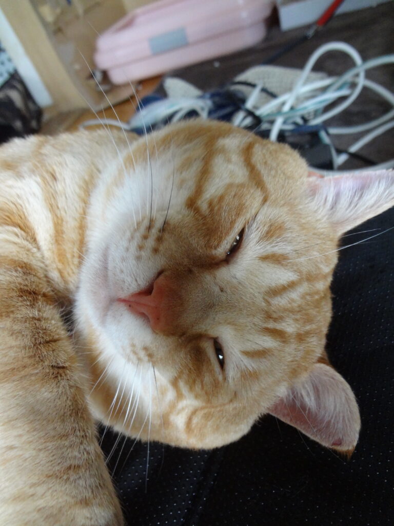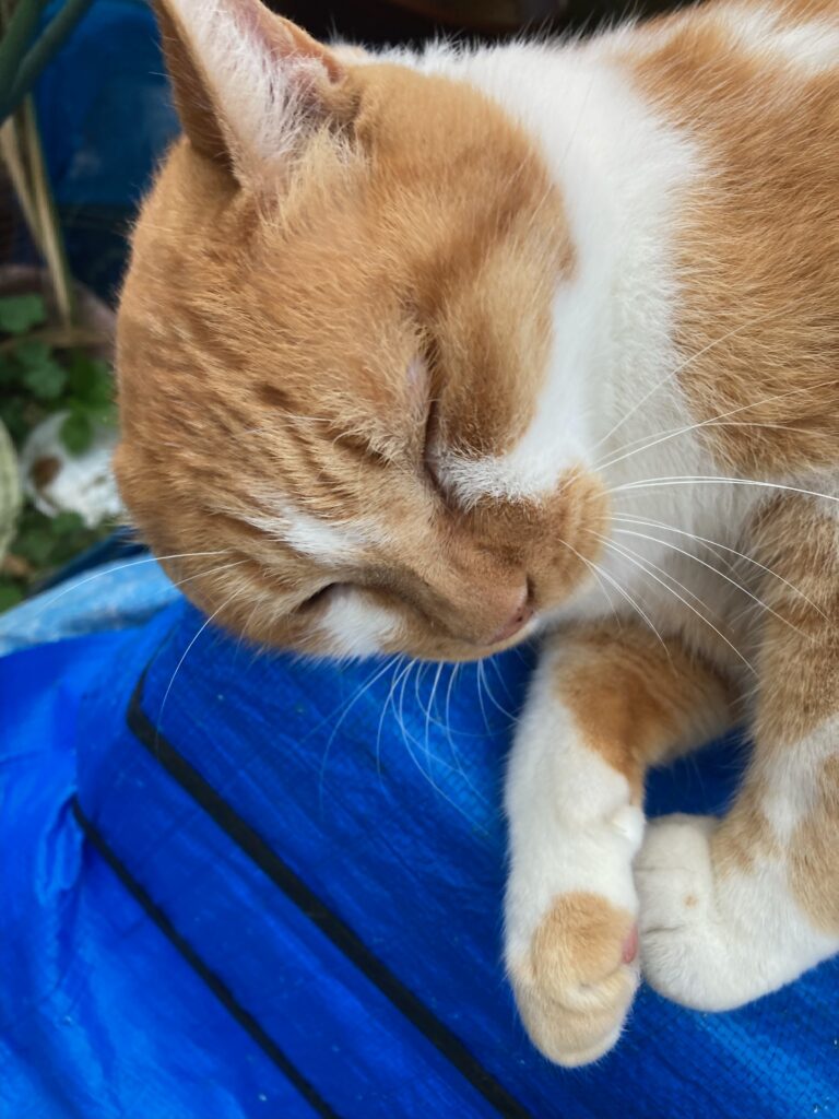 虎白の猫君の寝顔です。とてもかわいいですね。車には気を付けて元気に長生きしてね。