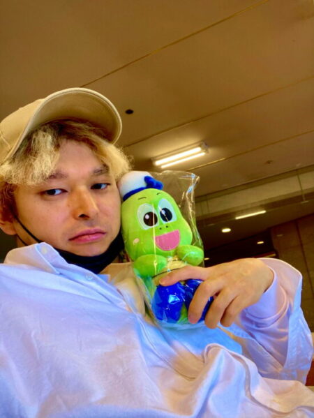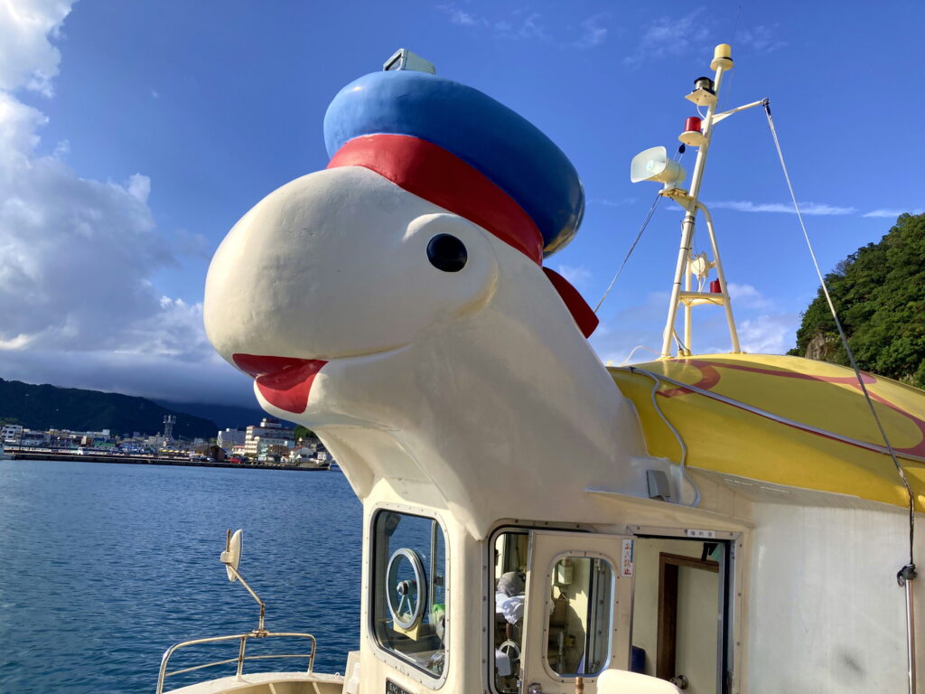 お客様、まいどおおきに、息子です。母親の療養を兼ねて勝浦のホテル浦島さんに行ってまいりました。私とホテルのゆるきゃらのウミガメのタッキー君、後送迎船のウミガメ号。