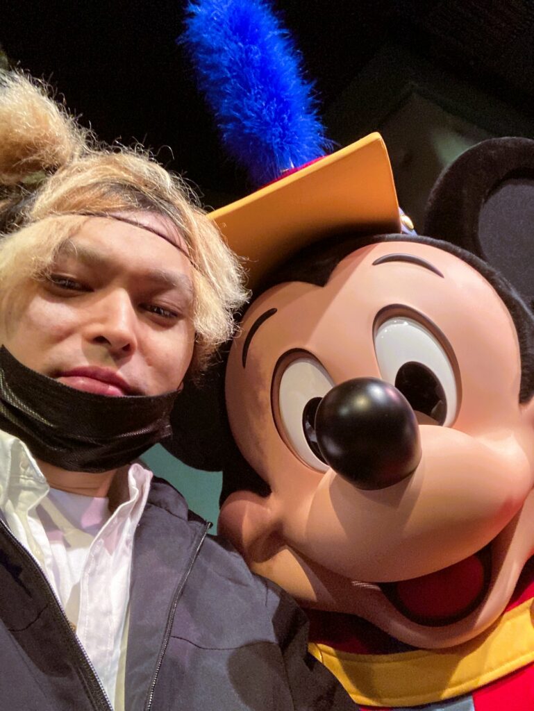 ミッキー君と記念撮影。並んだので疲れ顔でした・・・