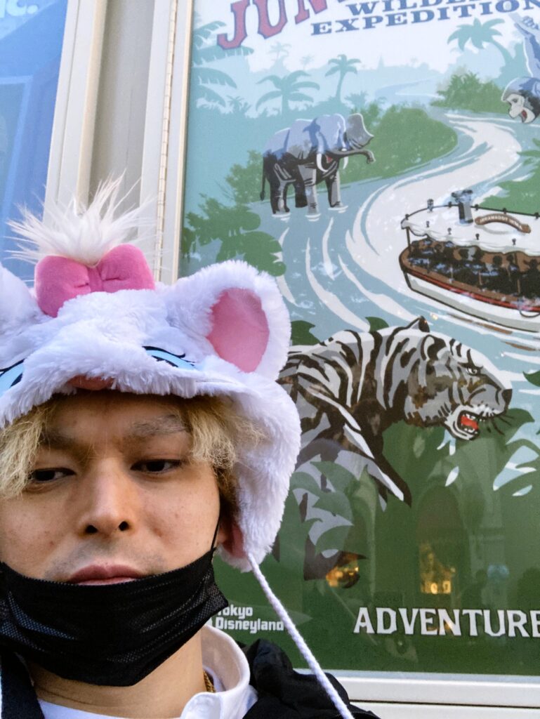 ジャングルクルーズのポスターに、大好きな虎君を見つけ、記念撮影。顔が怖いですが、寒いからです・・・