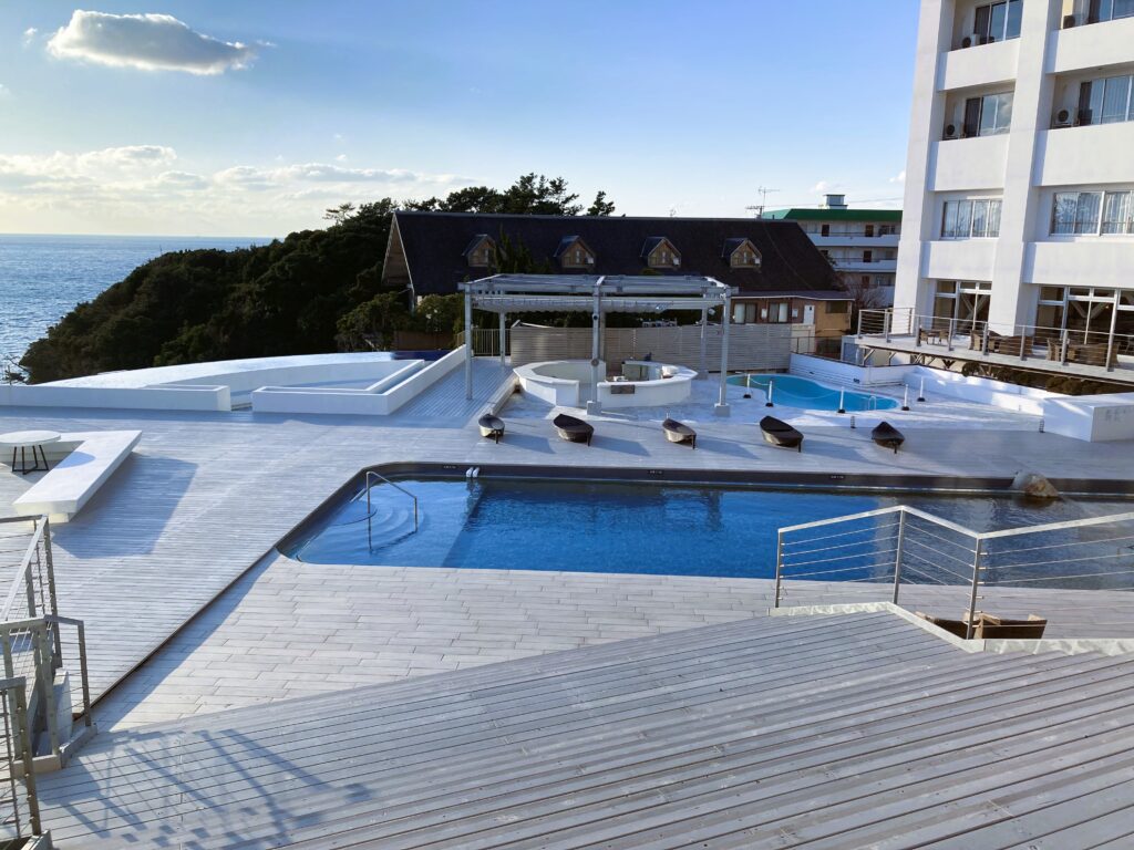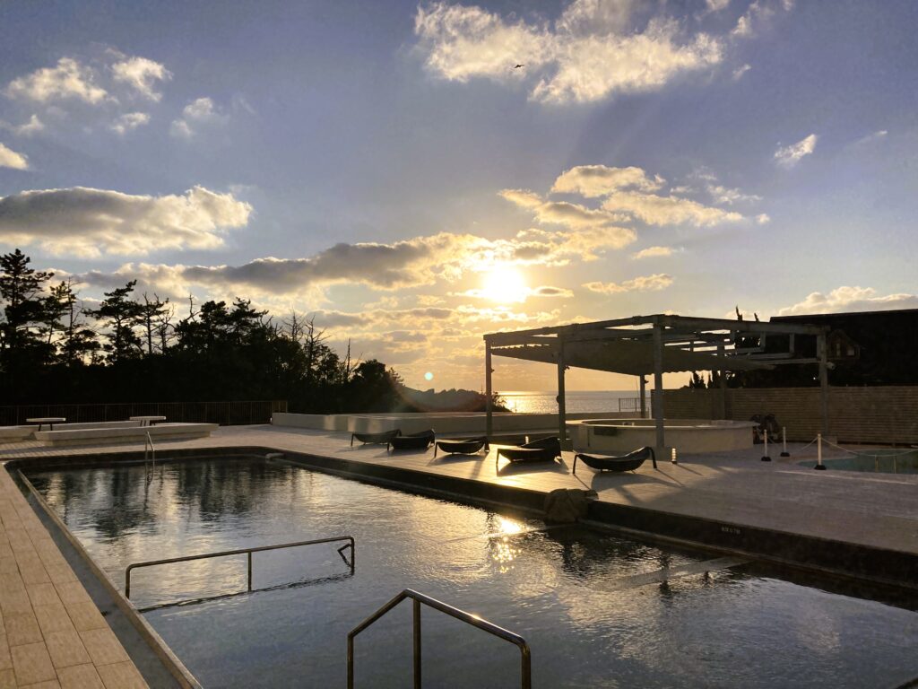 温泉水のプールで、景色も最高でした。寒いので泳いでる方は居なかったのですが、夏は楽しそうです。