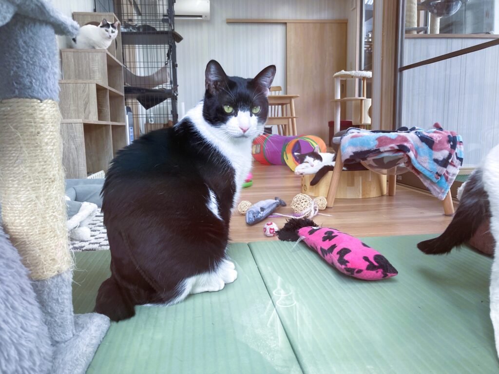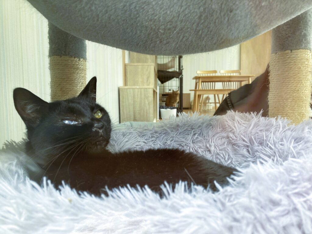 片目が悪い黒猫君、お昼寝中に起こしてしまいました・・・ とても賢そうで、健康状態、毛並みなど良い猫さんばかりです。